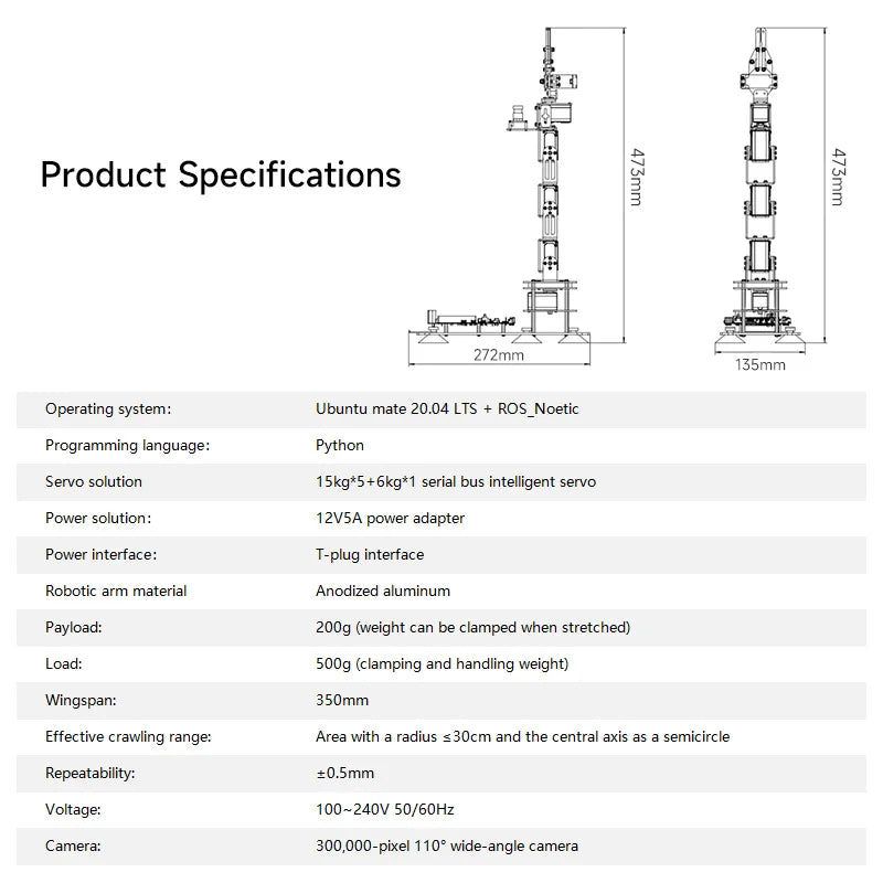 - 6 Bus Servos: The arm is equipped with 6 powerful servos that provide real-time readback of position and status information, ensuring precise control. 📈